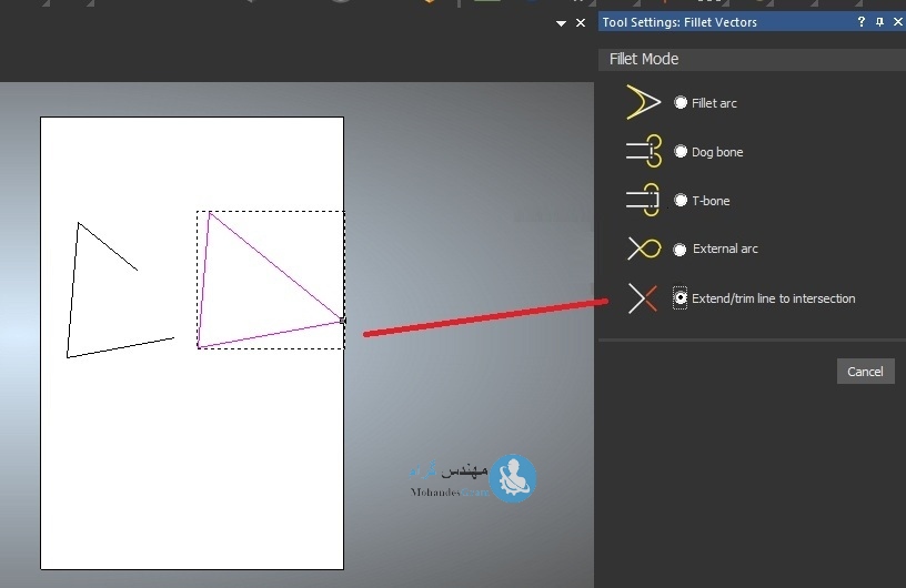 ♦ بخش Extend/Trim Line To Intersection: توسط این بخش می توان وکتور باز رسم شده را ببندید. بدین ترتیب که دو ضلع باز آنقدر امتداد می یابد تا در یک نقطه یک دیگر را قطع کنند در تصویر زیر می توانید نمونه ای از کاربرد این قسمت را مشاهده نمایید، دقت داشته باشید که دو ضلع مورد نظر که می خواهید یکدیگر را قطع کنند باید توسط مکان نمای موس انتخاب شوند.