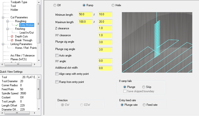 اگر گزینه ramp فعال باشد ابزار به صورت شیب دار و حرکت رفت و برگشتی به کار نفوذ می کند اگر گزینه ی helix فعال باشد ابزار به صورت کمانی به کار نفوذ می کنند.